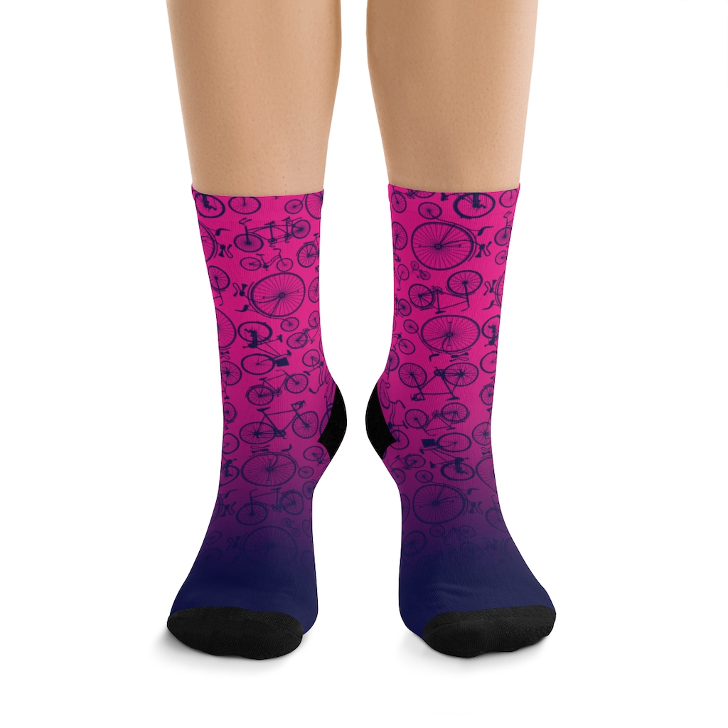 These socks are made using a proprietary blend of yarns. They are 200 needle knit crew made from 58% Recycled Polyester 22% Nylon 15% Cotton and 5% Elastane. One size fits most, and fit up to size 12 Men’s (U.S.). These socks have an unprecedented amount of stretch with durable print quality.